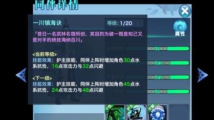 一川镇海诀:同伴上阵时增加角色水系抗性,攻击力和闪避。