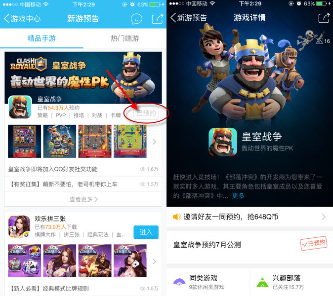 第二步:进入新游预告就可以看到皇室战争预约,点击预约即可,是不是很简单。