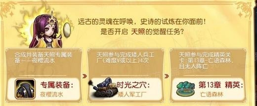 觉醒之旅第三站:天照参与完成精英关卡:第13章-亡语森林,且无人阵亡,1次。