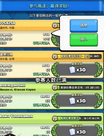 皇室战争中玩家可以免费加入其它玩家组织的锦标赛。达到8级即可解锁锦标赛模式。