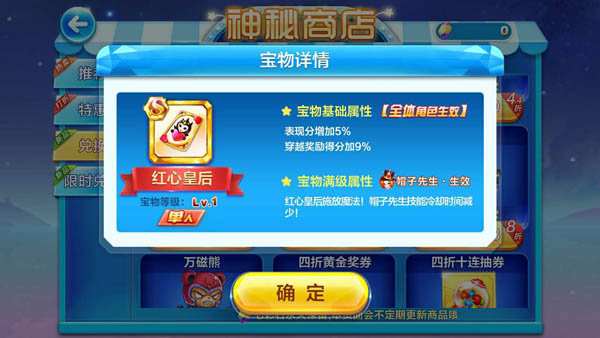 红心皇后这款宝物并不是特别的专属宝物,而是可以通过万能碎片来合成的哦。这也就意味着大家可以到探宝系统中去抽奖来获得红心皇后这款宝物!