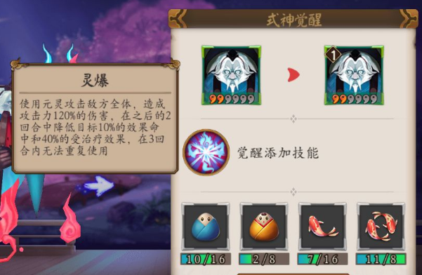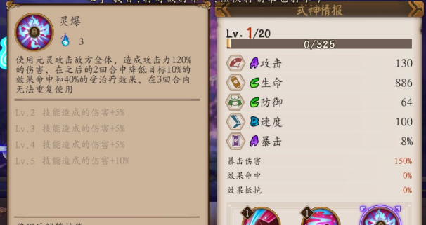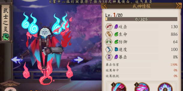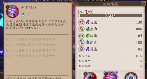 释放元灵对敌方群体造成攻击力93%的伤害,元灵存在期间使用鬼火的敌人会受到武士之灵攻击力50%的伤害。