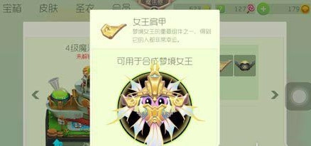 上图所示的这款圣衣是非常好看的梦境女王,想要合成这款圣衣还需要一种非常特殊的组件,就是图中所示的材料,他是合成这款圣衣的重要组件之一,得到它的人都是非常幸运的哦,玩家的魔法屋升级到四级的时候就可以解锁这款材料,并且通过比赛获得宝箱来开启获得更多的机会!