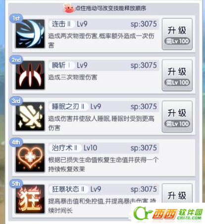 二连,三连,睡,治疗,狂暴 (吃一个连击,要求SP达到5W)