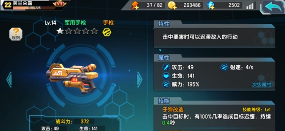 优点:前期来说武器能力不错,有减速还加暴击伤害。而且手枪也算是武器中比较轻便的,放起风筝打BOSS还是不错的。碎片也比较好得,升星较为容易可以快速形成站力。