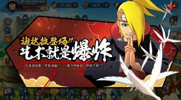 火影忍者手游迪达拉登场,可通过高级招募获得,但与此同时,深受玩家喜欢的鼬却要下架了!对于至今没抽到鼬的玩家(包括西西),现在最关心的就是鼬下架了还会再出么?下面就让西西来告诉大家吧!