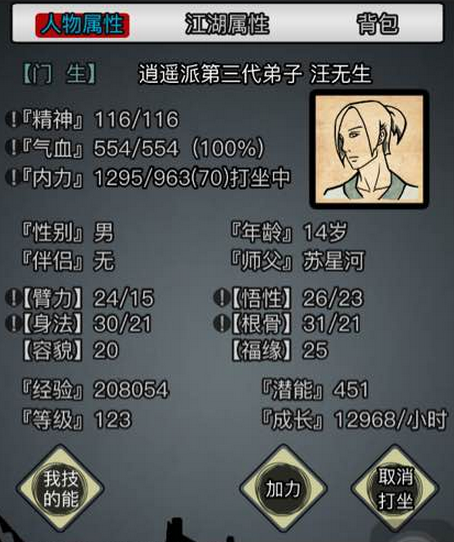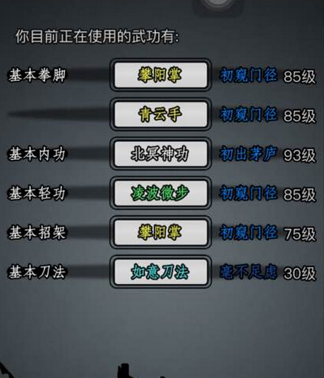 剩余的属性点用来学习基础,不要乱练技能,招架影响防御,高了以后会经常格挡攻击,轻功影响闪避以及非常非常小的出招速度,臂力影响伤害(但目前没发现能加多少),这里有个重点问题就是到底应该修招架还是轻功,其实轻功还需要你的基本需要配合其他武学,但是招架却可以直接和你主修的攻击武学一起使用,所以推荐先升招架。