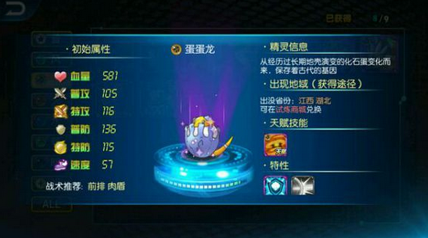 3个特性,一个登场加防血,一个一半几率技能伤害减半,一个诈尸(复活)。自带技能是给生命最低的精灵回血,唯一一个肉盾自带奶水技能,虽然是省特只有22成长,但是陪你一直走到最后没有问题。