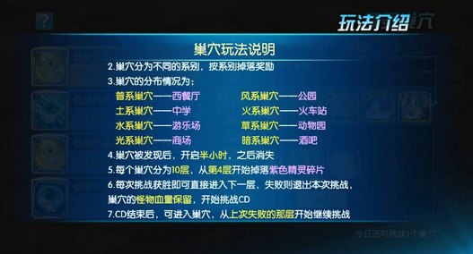 每个巢穴被刷出后,会开启半个小时,这半小时内都可以进入巢穴挑战。巢穴共分为10层,玩家每次从第1层开始挑战。战斗胜利可以直接进入下一层继续挑战(精灵血量等战斗状态继承);战斗失败则退出巢穴,开始冷却倒计时(可以花费一定钻石直接清零),倒计时结束后可以从上次退出的那一层开始继续闯关(怪物血量会继承上一次的状态),至少通关10层。