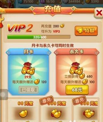 月卡则是从充值开始一个月内每天可以领取120元宝,需要30元。