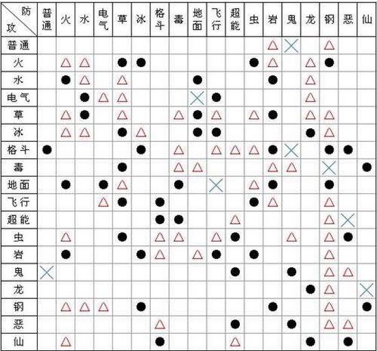 其中,●表示两位伤害,△表示0.5倍伤害,×表示无影响