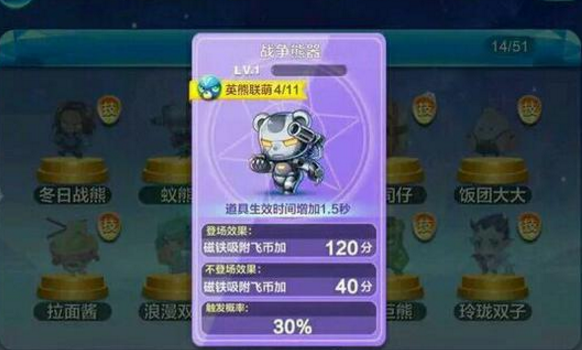 战争熊器登场效果:磁铁吸附飞币加1600分