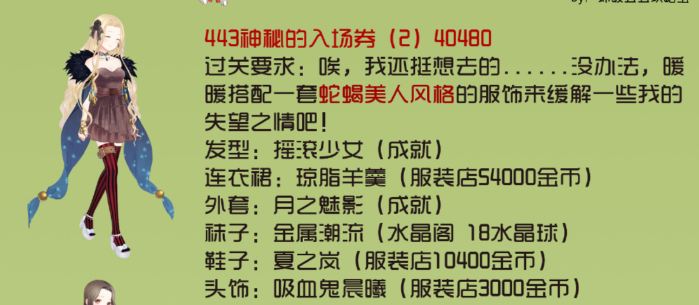暖暖环游世界的巴西地图的关卡中,暖暖要来帮助搭配一套有着蛇蝎美人风格的服装,这一关的搭配中,要来用到一些比较性感类型的服装了,那么我们就一起来详细的看一看暖暖环游世界的443神秘的入场券2中的具体的搭配的推荐吧。
