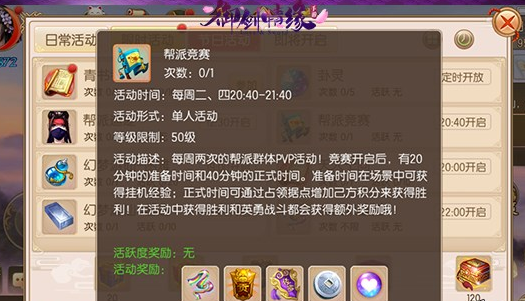 3、 成功加入帮派两天以上,等级达到50级的玩家,才能参加本帮帮派竞赛。