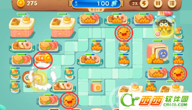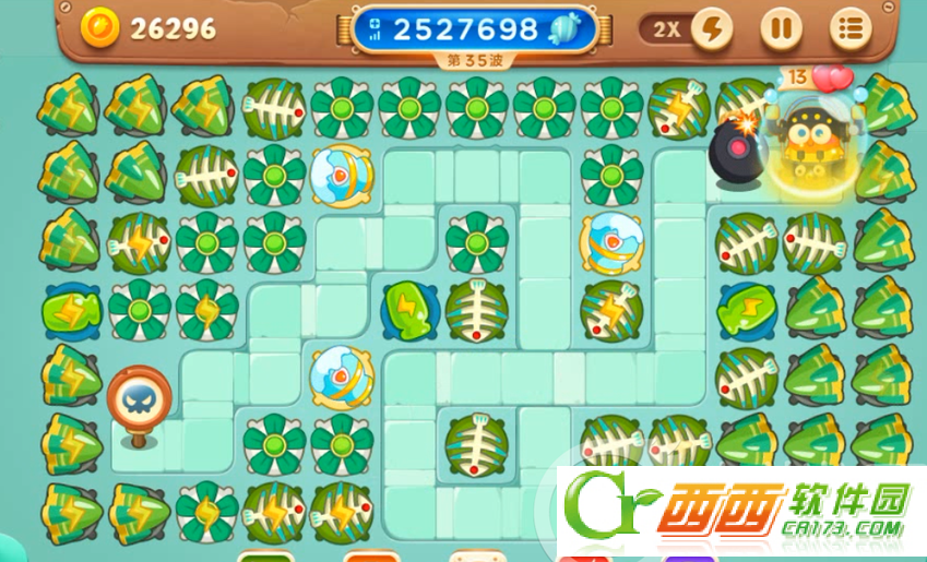 解释下,风扇、鱼刺、导弹以及1种减速塔 是必备的。雷达代替导弹效果会差蛮多。减速塔里面最好的是冰冻星跟月亮,实在没有的话,雪球也可以将就。瓶子炮可以给攻击范围内的炮塔加10%攻击力,有最好,没有也不必强求。太阳花、章鱼、毒气瓶这些是快速清理道具的首选炮塔,同样是有最好,没有不必强求。关于蘑菇,有些人反应和手速比较慢,可以用蘑菇在第一个飞碟刷几万金币。
