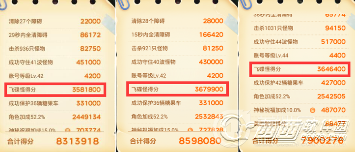 接着是飞碟加成分。越快打死飞碟,得分越高。看以下数据,有些萝卜丝同样是打死第四个飞碟,但是这个分数只有350W。目前这个分数最主要是体现在杀第四个飞碟上。由于现在有BUG,第四个飞碟空血的时候有可能无法选为攻击目标,所以这个分数比以前更难提高。BUG的破解办法是用范围攻击的炮塔打小怪,同时能打到飞碟1下,飞碟就死了。