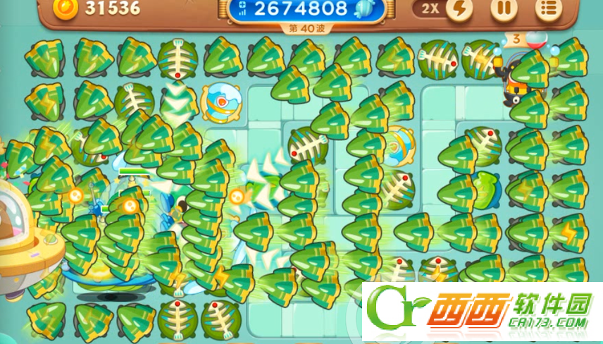下面是关键的40波。只要没用复活(剩1点血都无所谓)见到第四个飞碟,就已经赢了一大半了。这时候基本上风扇卖得只剩2、3个(防飞碟BUG),鱼刺尽量布置在道路密集的地方,能保证同时有8-10个鱼刺攻击到小怪是最好的。