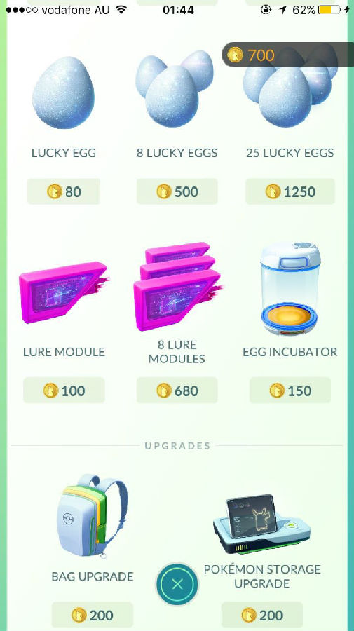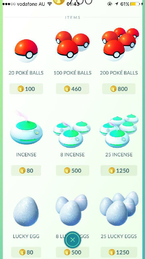 简单说一下商城道具,道具有红白精灵球,双倍经验蛋(lucky egg 30分钟),白绿色个人香(可以吸引小精灵来到你身边,你身上会在发紫色的光,可以跟随你移动,30分钟),紫色团体大香(吸引小精灵来到你身边,范围内多人一起享受同等效果,团体大香只能在补给点使用,30分钟 不可移动),孵化器(字面意思,每个人只可以最高同时孵化9个蛋,有一个是免费永久的,商店的可以用三次)。两个背包,第一个是道具背包,初始只有350,一个背包50空间。另一个是小精灵背包。