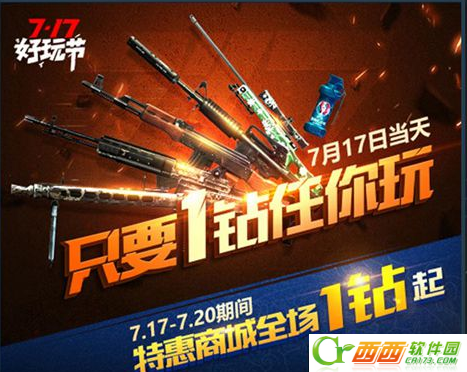 在7月17日活动当天,注意是当天!AWM-茉莉(7天)、MG3-迷彩(7天)、欧罗巴之星(7天)、M14EBRE-迷彩(3天)、M4A1-A(3天)、AK47-B(7天)以上这些武器都可以1钻石买下来,东东在这里教大家一招,17日当天你要玩的武器早上先买下来,另外剩下的等到晚上再购买,这些一些武器按照时间计算的,你可以在活动最后一天还有武器可以用。