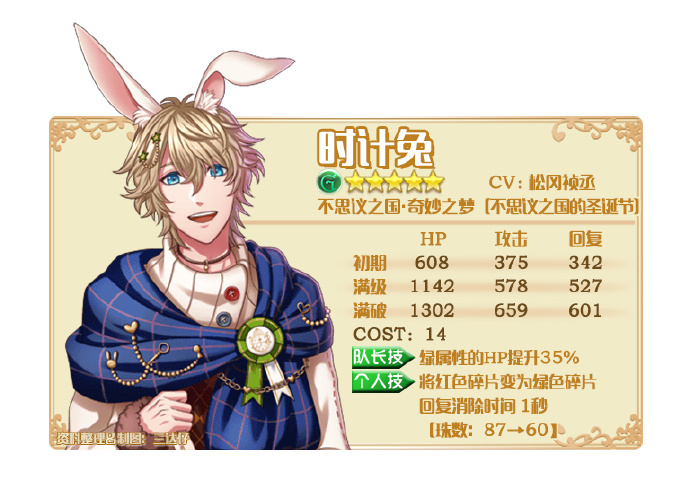 梦100时计兔王子三围多少?梦100sp时计兔剧情怎么玩?梦100时计兔剧情攻略萌萌的时计兔,蓝色的眼睛超级好看,萌萌的兔子耳朵日觉状态下简直超可爱。那么想要攻略时计兔,就来看看时计兔的剧情攻略吧,西西为各位公主们带来时计兔的详细数据和攻略,快来看看吧!