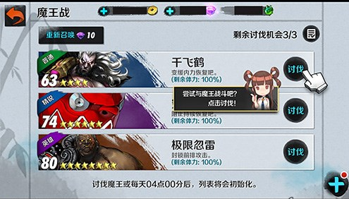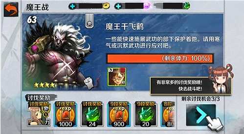魔王战每个玩家每天有三次攻打的机会,有普通、精锐、英雄三种BOSS级别可以选择。简单的BOSS耗时较短,击杀较为容易,但是奖励相对要少一些。英雄级别的BOSS,部分玩家一次不能击杀,只能获得7、8段的奖励。每个人可以根据自己的情况来选择,一次可以打完英雄BOSS的,可以三次都选择讨伐英雄BOSS,打完后免费重新召唤。战力较低的,可以选择精锐BOSS和英雄BOSS进行讨伐。