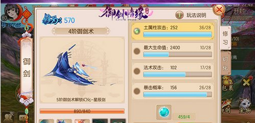 在游戏中进阶御剑术同样可以提升自己的属性从而提高修为。随着御剑术的进阶,玩家不但可以习得新的御剑动作,还可以解锁幻化更酷炫的飞剑外观!