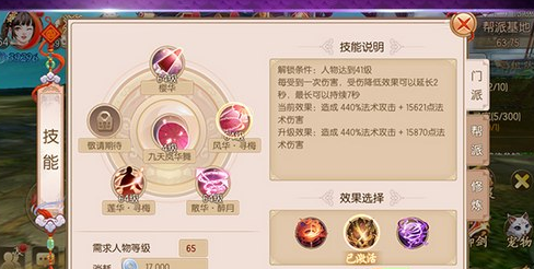 随着角色等级提升,角色的一系列技能也可以通过升级来得到进一步地加强,门派技能是所有技能中最容易提升的,它只需要消耗少量银币即可升级,所以我们需要尽可能地将门派技能等级与角色等级达到同步,并且随着门派技能等级的提升会相应的解锁更厉害的技能效果。