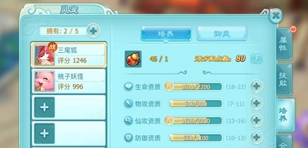 您可以通过选择单次培养或10倍培养的方式消耗一定数量的灵狐仙丹道具来进行灵宠培养,培养可提升当前灵宠资质,资质的提升最终影响灵宠属性。资质共分为5类:生命资质、物攻资质、仙攻资质、防御资质、速度资质。