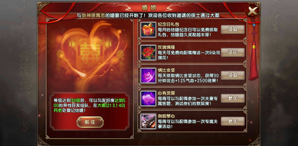 异性玩家等级均达到30级,友好度500以上,便可以到大都月老处登记结婚