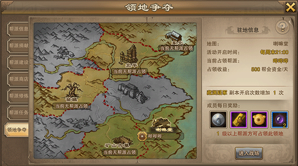 这个我重点介绍下在当前服务器中可供争夺的帮派领地,共5块区域,当帮派等级达到2级时,允许帮派成员在每周的固定时间进入战场争夺领地的归属权。一旦占领可以为帮派所有成员带来很多资源奖励,因为参加领地争夺作为帮会成员是必须的。