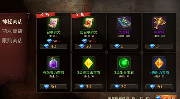 卖的东西全部是钻石道具,金币箱子里面有10万金币,限购10个,前期推荐买吗。装备强化石前期都是过度装备可以先买存着等要用拿出来,可以买满。各种3、4级宝石选择魔攻和物攻在考虑生命宝石。优先顺序攻击属性宝石,前期生存并不需要太多,后面PK堆血量可以大量购买生命宝石。第一次10钻第二次20钻,后面按照次数继续叠加。