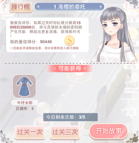 第一关,一次最多获得6张契约书,必须落在分段内,不然即使S也只有5张!属性是简约活泼成熟清纯保暖,TAG是冬装但并没什么用。技能只需要带一个微笑,对面NPC放挑剔的时候,马上补一个微笑就行了,放两次挑剔就补两次微笑,其余技能都别按!都别按!