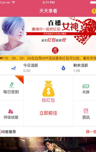 抢红包:每日8点,下午2点都可以抢红包将会获得不等的现金奖励,