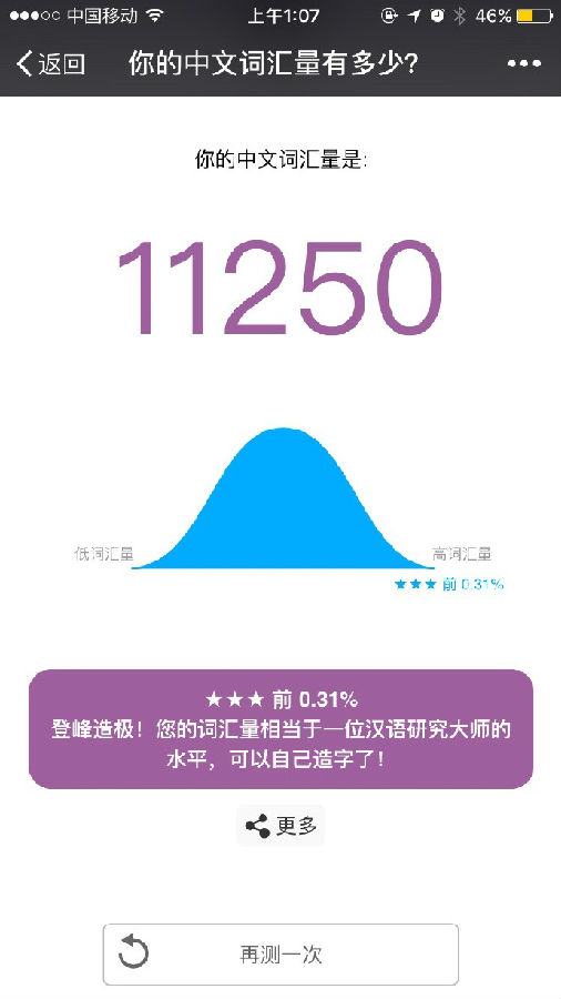 对于词汇量这一词,权威机构的标准有诸多不同。我们参考『江苏大学 何南林教授 《语言文字论辩集》』、『北大外语学院世界文学研究所教授 辜正坤 《汉语与拼音文字》《54种中西文化比较》』等学术著作,创建了自己的模型,制作了这份测试。赶紧来挑战一下吧!(考虑到测试本身的学术性,以及参与测试者的年龄跨度可能非常大,本测试并不包含任何网络词汇)