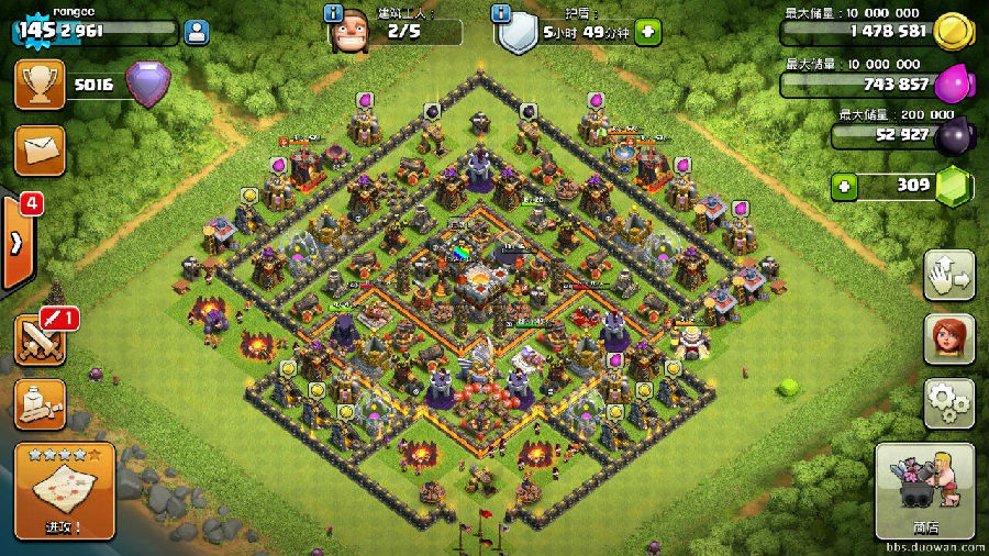 部落援兵不管进攻 还是防守 都是1石头 1法师 1mm,安逸。(石头的好吃是可以引歪蛮王,,,,好吧,其实我就是懒得改捐兵要求,而且部落里提供狗的效率也不太高)