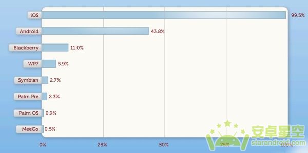 这次调查的应用开发商中,在 2010 年度大多对 IOS 和 Android 平台有着明显的偏好,所占比例分别为 99.5% 和 43.8%。黑莓以 11.0% 位居第三。