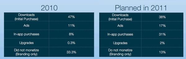 然而,在 2011 年,下载所产生的收入将减少,但它仍然占 38% 的最大比例。广告占 17%,程序的购买为 31%以及升级为 2%。2011年,只有 13% 的开发商说他们不会利用应用程序赚钱。