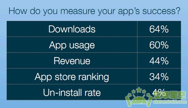 64% 的开发商是表明下载量可用来作为一个应用程序的成功与否的标准。其它衡量的标准为使用占 60%,收益占 44%,应用程序商店排名为 34% 和联合安装率为 4%。