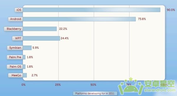 但是,从发展商 2011 年的规划来看,情况开始发生变化。90% 的人表示他们将继续偏爱 IOS,73.8% 的人选择 Android,黑莓和 Windows 7 的比例则分别为 22.2% 和 24.4%。