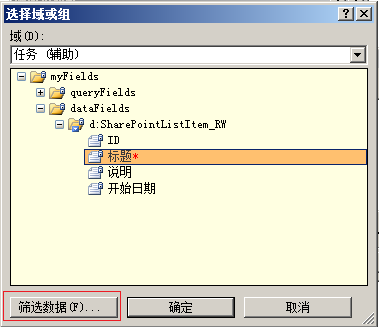 在"选择域或组"窗口中,在下拉框中选择第二步建立的辅助数据源,展开"dataFields"节点,选择"标题"节点,然后点击"筛选数据"。