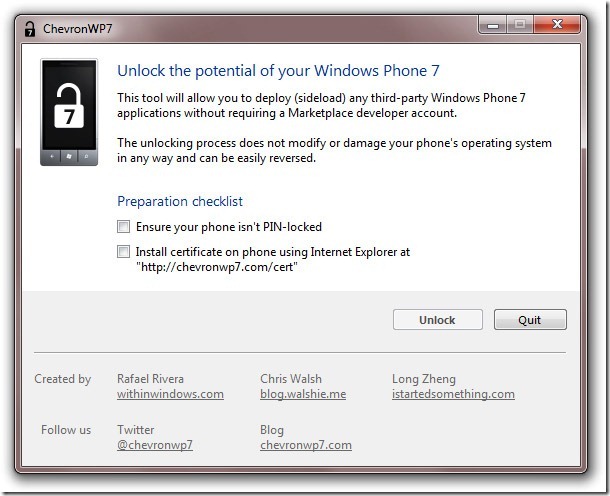 在去年的11月份有人爆出Windows phone7已经成功解锁. 其实这是Windows phone 7至推出z正式版以来 第一次遭到第三方解锁. 这次解锁源之于chevronwp7团队Long Zheng、Rafael Rivera 和 Chris Walsh 三人共同开发了一款名为“ChevronWP7”的 Windows Phone 7 手机开发者解锁工具,可以在没有开发者帐号的情况下通过 Sideloading 方式安装 WP7 应用,比如使用了私有 API、没有发布到应用商店的。解锁工具截图: