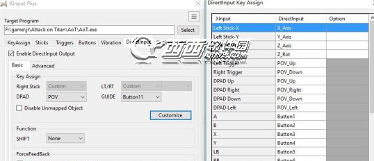 2.到Directinput 选项卡下,勾选enable directinput output ,点击custmize 设置right stick-x 为Z_axis