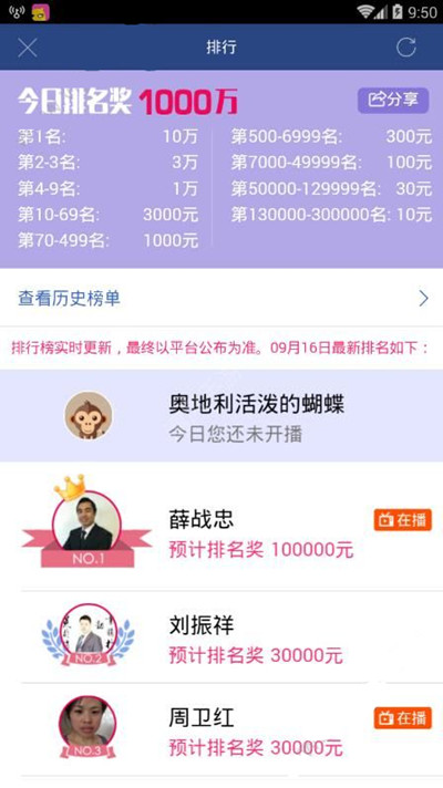 每日排名都有一个总额,例如今日总额为1000万元,在排行版上的主播都可以收到平台的打款,平台的奖金也是非常的丰厚,只要你敢于表达自己、说出对财经的独到见解就有机会得到多重大奖哟!