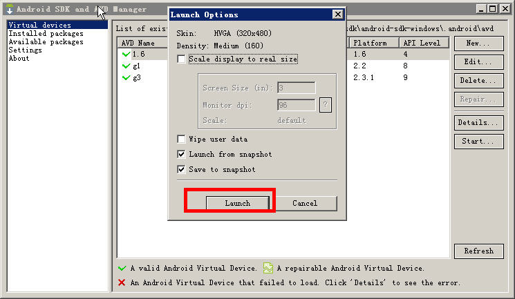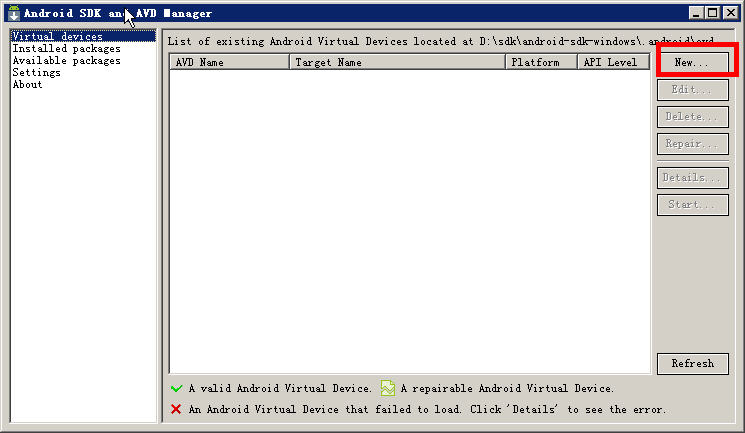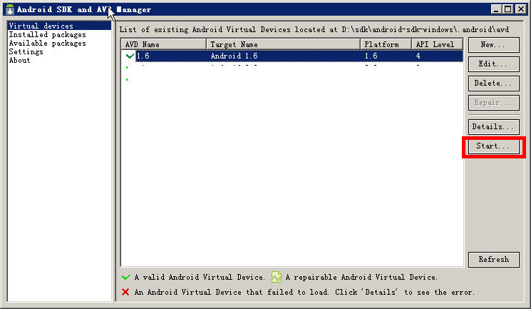 这时返回 AnDroid SDK and AVD Manager 里可以看到我们刚刚新建的设备了。点一下 Start
