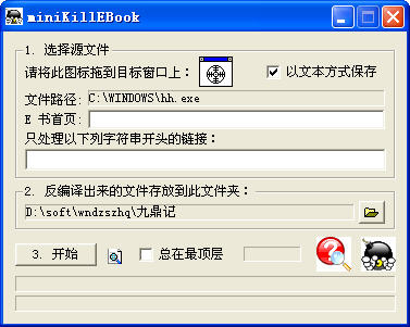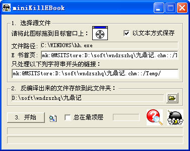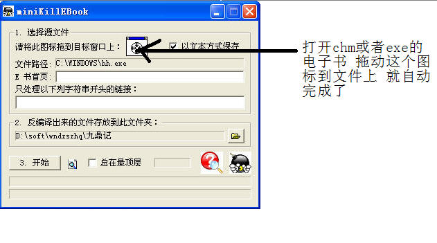 需要打开一个CHM文件或者 EXE文件 再把靶心拖到文件上,再点 开始。而且转换过程中 CHM 文件 不能关掉。