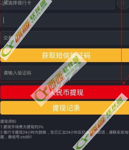 2、进入到人民币提现页面中选择银行卡,输入不少于100元的提现密码,手机短信验证码,然后点击人民币提现即可。