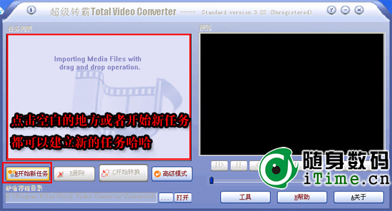 按照图片中的提示操作,点击空白地方之后弹出新建任务。我们选择 导入需要转换多媒体文件 ,然后找到你需要转换的文件之后双击确定。