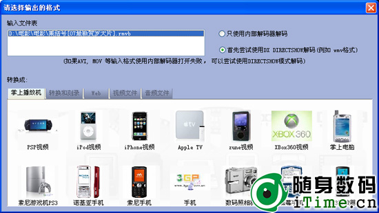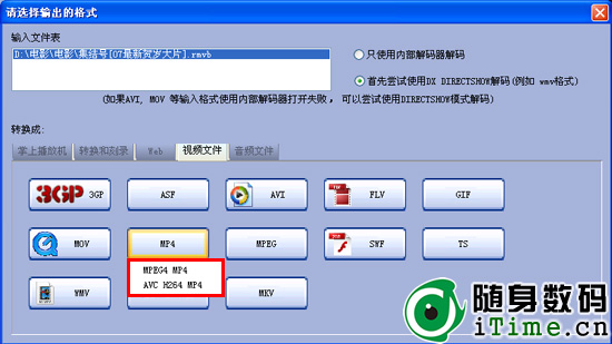 选好之后我们可以看到里面有很多的目标格式可选,而PSP、iPod、iPhone的格式都可以支持,不过我们需要点击视频文件这里,下面则列出了3GP、 ASF、AVI、FLV、GIF、MOV、MP4、MPEG、SWF、TS、WMV、MKV等格式,我们只需要点击MP4即可。如果大家需要转换成其他格式的同样是点击即可,非常简单。