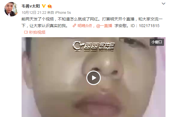 蓝瘦香菇本人表示前两天发了个视频,不知道怎么就成了网红。打算开个直播,和大家交流一下,让大家认识真实的蓝瘦香菇本人哦。今晚8点(10月13日),@一直播 求安慰。ID:102171815 。