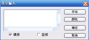 : 点击弹出以下文字输入对话框,用户在输入框中输入所加的文字,选择好字体、颜色及排放方式点击确定文字添加到相册中,点取消则返回主界面。